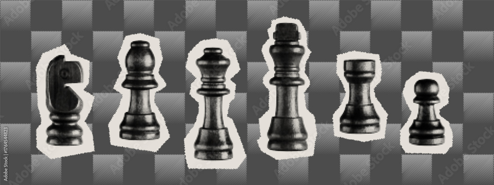 Photos Vector collage of chess pieces with halftone texture and torn paper effect