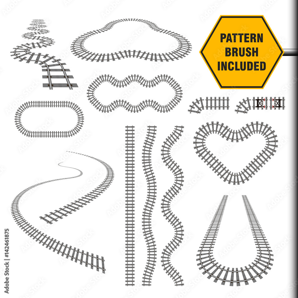 Photos Vector illustration that include new railway border or railroad pattern brush and ready for use curves, perspectives, turns, twists, loops, elements, all rail transport path motives isolated on white