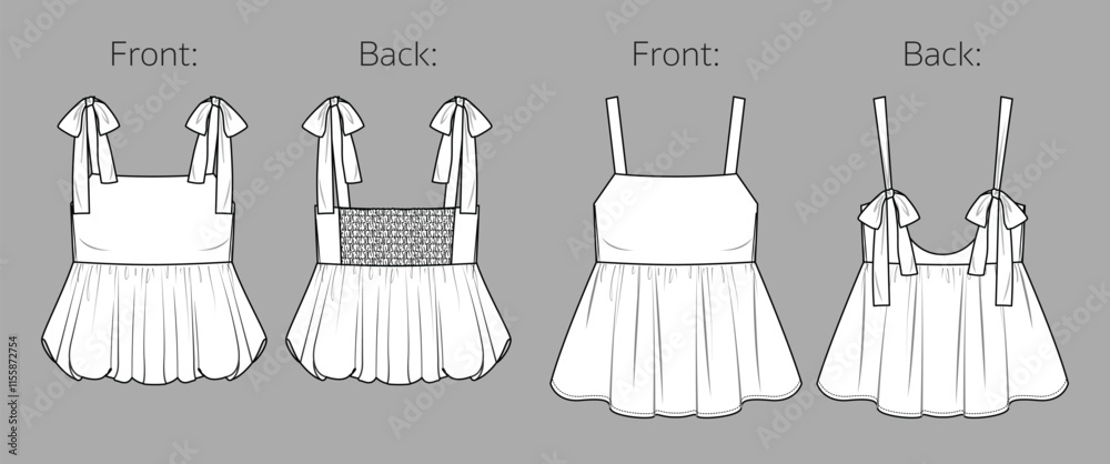 Photos Vector sleeveless top with ruffles fashion CAD, summer woman tank top with frills and shoulder straps technical drawing, template, sketch, flat