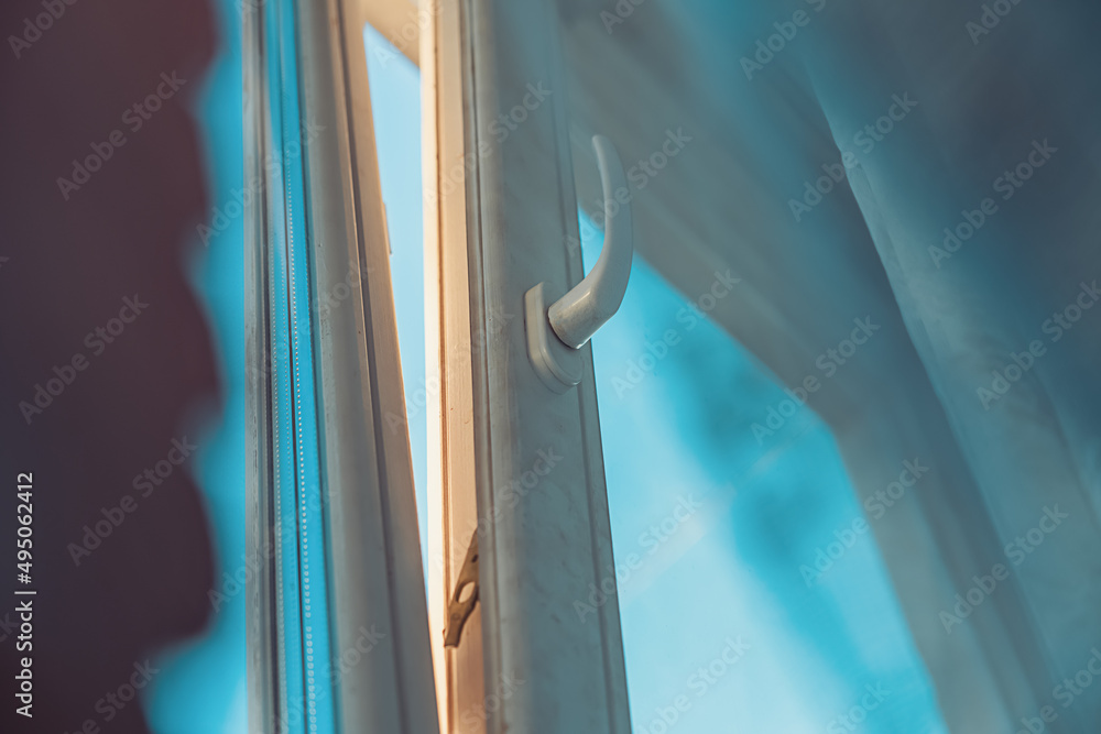 Tableau sur toile View from below to white plastic open window frame at sunset