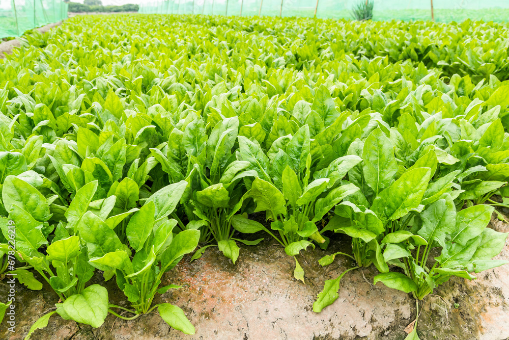 Photos View of Fresh Spinach growing in a vegetable garden in Yunlin, Taiwan