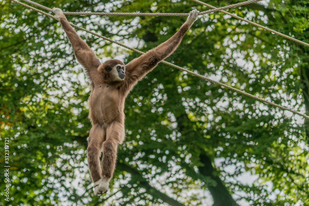 Tableau sur toile White handed gibbon hanging on ropes between the trees