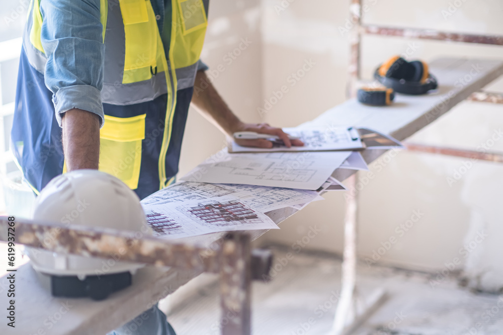 Photos Worker checking renovation project papers put on construction equipment near hel