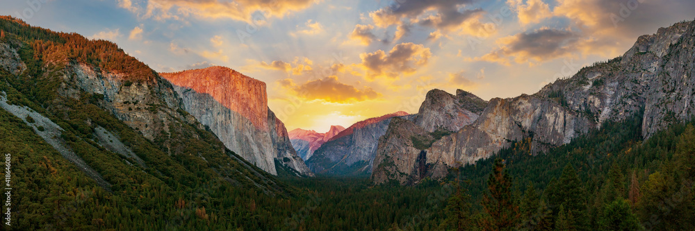 Yosemite valley nation park during sunset view from tunnel view on twilight time. Yosemite nation park, California, USA. Panoramic image.