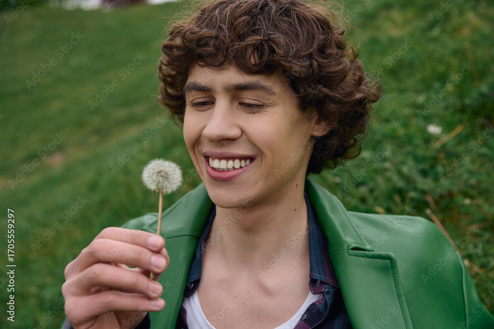 Photos Young student enjoys a peaceful stroll outdoors while admiring a dandelion bloom